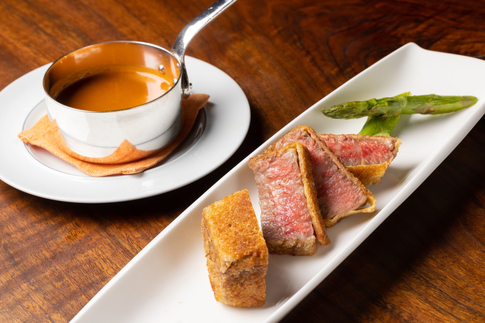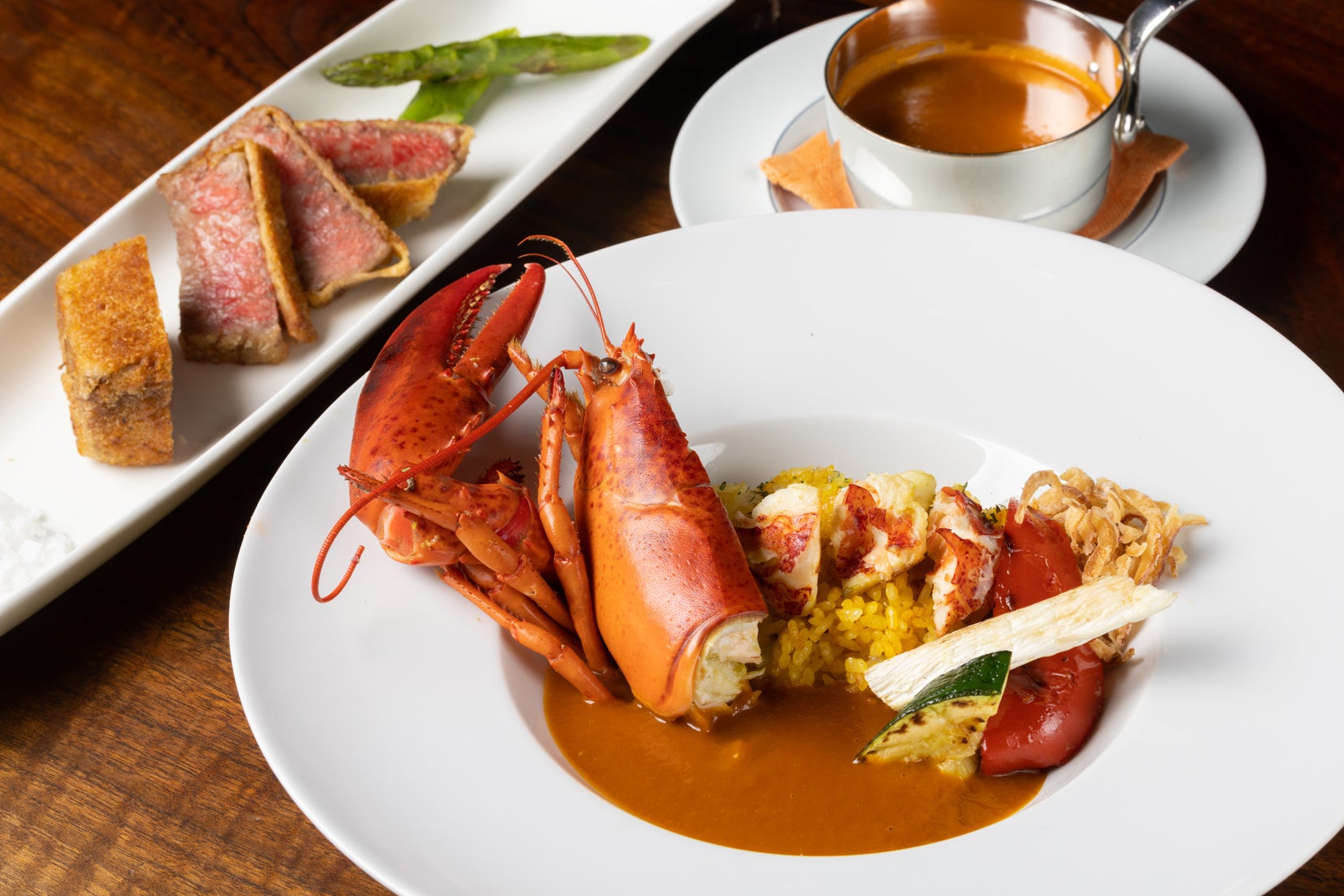 この『濃厚ビスクカレー 「けやき坂 ビーフ」のカツレツ添え』は、カツレツ、カレーのルー、フライドライスそれぞれが1つのメニューとして完成されています。東京都唯一の黒毛和牛である「秋川牛」にキヌアやカカオ、ブルーベリー、海藻などのスーパーフードを配合した飼料で育てられたホテルオリジナルの黒毛和牛「けやき坂 ビーフ」は、イタリア産の黒トリュフで1晩マリネしトリュフの芳醇な香りをまとわせた後に、鉄板で揚げ焼きしてカツレツに仕上げます。カレーのルーは、ロブスターの殻をオーブンで香ばしく焼いた後に、ハーブの1種であるタイムやクラム ジュ(貝の出汁)などとともに煮込んだあと、裏ごしを繰り返した滑らかな口当たりのビスクがベースです。そこにクミンやオレガノなどのスパイス、隠し味として長崎県産のからすみを加え、魚貝の風味豊かなオリジナルのビスクカレーが出来上がります。さらに、サフラン香るライスは、ロブスターの身とともにゲストの目の前の鉄板で炒めます。カツレツ、ルー、ライスとそれぞれの味わいをご堪能いただき、さらに掛け合わせることで相乗効果が生まれ、ラグジュアリーな豪華食材の共演が口の中に広がります。
