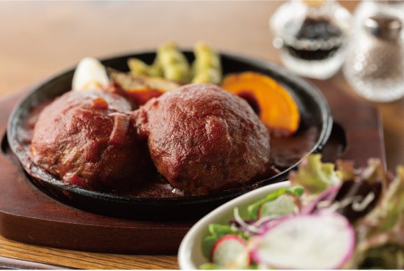昼食には「窯焼きバーグ五十八」のハンバーグ、カフェタイムには「おかしの時間」の森のチーズケーキをお楽しみください。