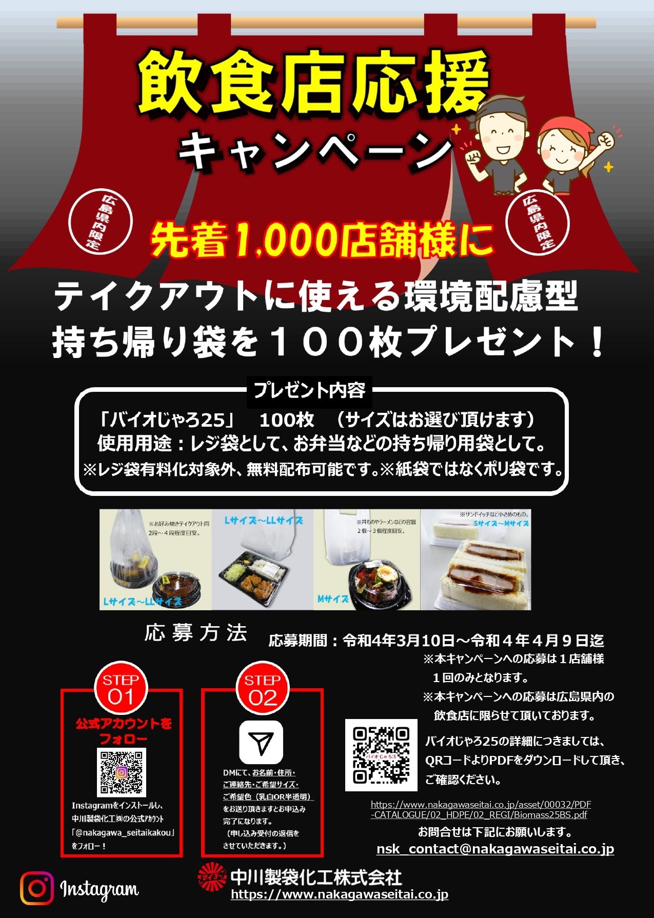 レジ袋やポリ袋を製造する中川製袋化工株式会社(所在地:広島県大竹市、代表:中川兼一)は、2022年3月10日から同4月9日までの1ヶ月間、広島県内の飲食店を対象に、テイクアウトに活用できるレジ袋を、合計10万枚無料で提供する「広島県内飲食店応援キャンペーン」を開催いたします。