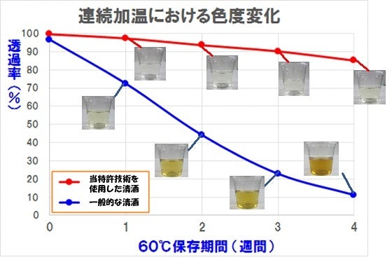 <連続加温比較:当特許技術を使用した清酒と一般的な清酒の比較>
