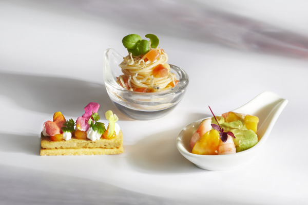 また、今回はセイボリーにもフルーツを使用したメニューが一部登場します。小海老にアボカドとマンゴーを合わせた「小海老のマリネ レモンジュレ」は、まろやかながらさっぱりとした後味です。その他、うまみたっぷりのフルーツトマトを使用した冷製パスタ「じゃことバジルのアッラケッカ」や、旬のグリーンピースのジュレとヴィシソワーズを合わせた「グリーンピースとポテトのアンサンブル」など、初夏にぴったりな清涼感あふれるメニューが揃います。