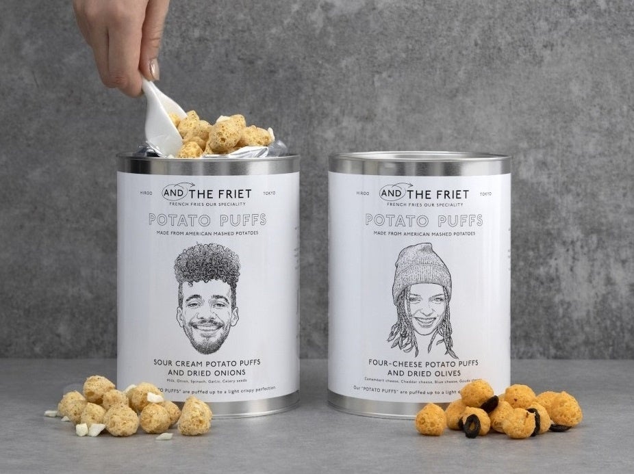 東京・広尾で行列のできるフレンチフライ専門店「AND THE FRIET」が開発した、ベルギー産ポテトの黄色の果肉とうまみを活かした”サクサク食感”のプレミアムスナック「ドライフリット」。アメリカ産のマッシュドポテトをパフに仕立てたひと口サイズのスナックは、香ばしいポテトの香りと、食べごたえのある ガリガリとした食感がやみつきのおいしさです。ペンキ缶のようなパッケージには、PLUG-IN GRAPHIC の平林奈緒美氏によるアートディレクションが施され、 Anje Jager 氏によるカップルのイラストが描きおろされています。カマンベール、チェダー、ゴーダ、ブルーチーズフレーバーのポテトパフに、乾燥させた塩蔵オリーブ「クワトロチーズ アンド オリーブ」と、サワークリームフレーバーのポテトパフに、ドライ加工したダイスカットのオニオンを加えた「サワークリーム アンド オニオン」の2種です。