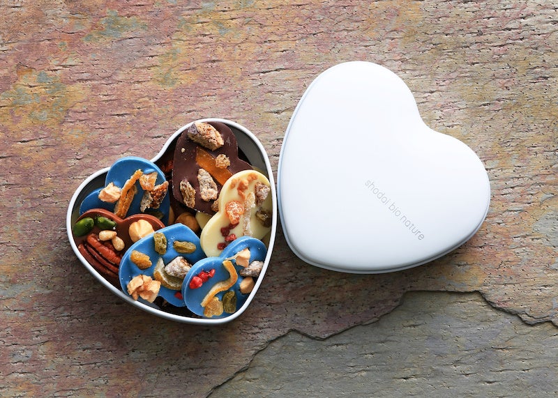 ナチュラル素材を積極的に取り入れたパティスリー。華やかで美しい日本人の季節の感性を映しこんだようなスイーツの数々は人気です。フィヤンティーヌ(薄焼きクレープ)入りのチョコレートに、ペカンナッツ、ヘーゼルナッツ、アーモンドなどの木の実や、あんず、黒いちじく、オレンジなどのドライフルーツを飾り仕上げました。ビターとミルク、ホワイト、ブルーの4種類入りです。