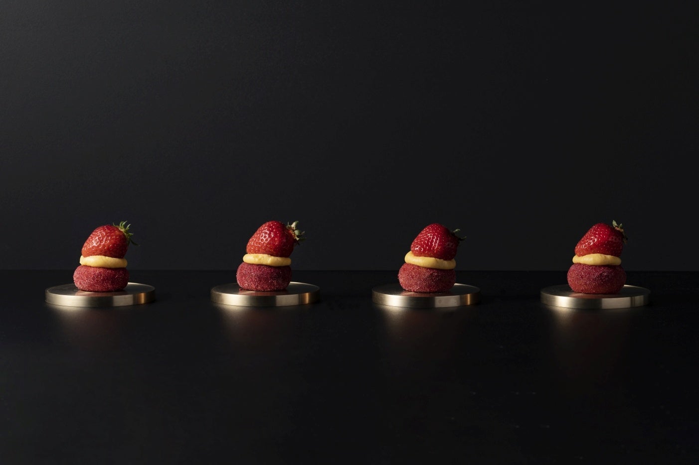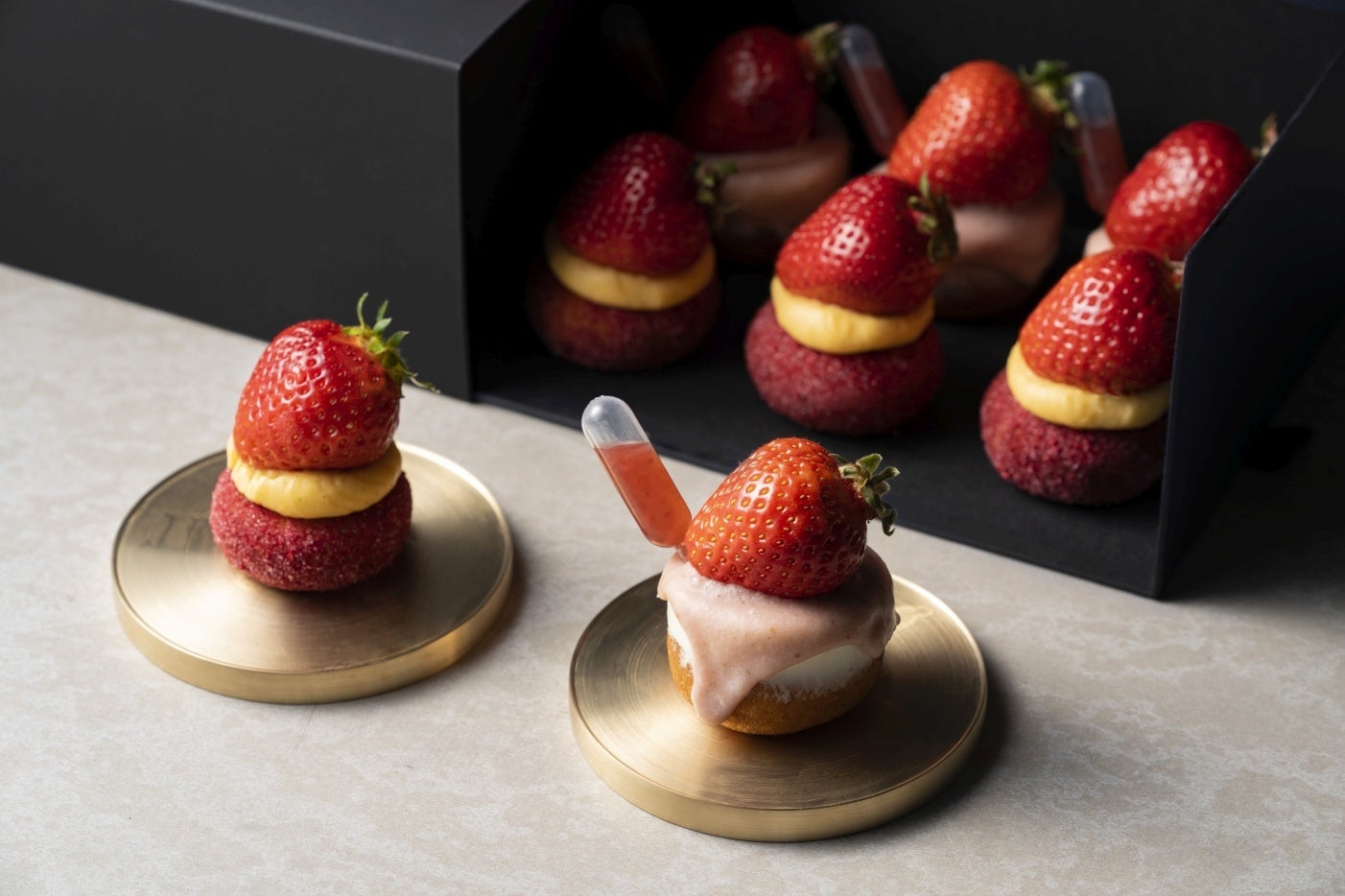 ラズベリーの香りをまとわせたやわらか食感のドーナツと濃厚なコクのあるカスタードクリームの上にイチゴソースを混ぜ合わせたサバランシロップでコーティングをしたあまおうイチゴを丸ごと一粒。