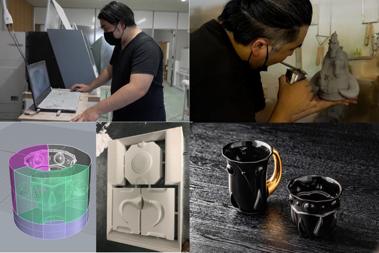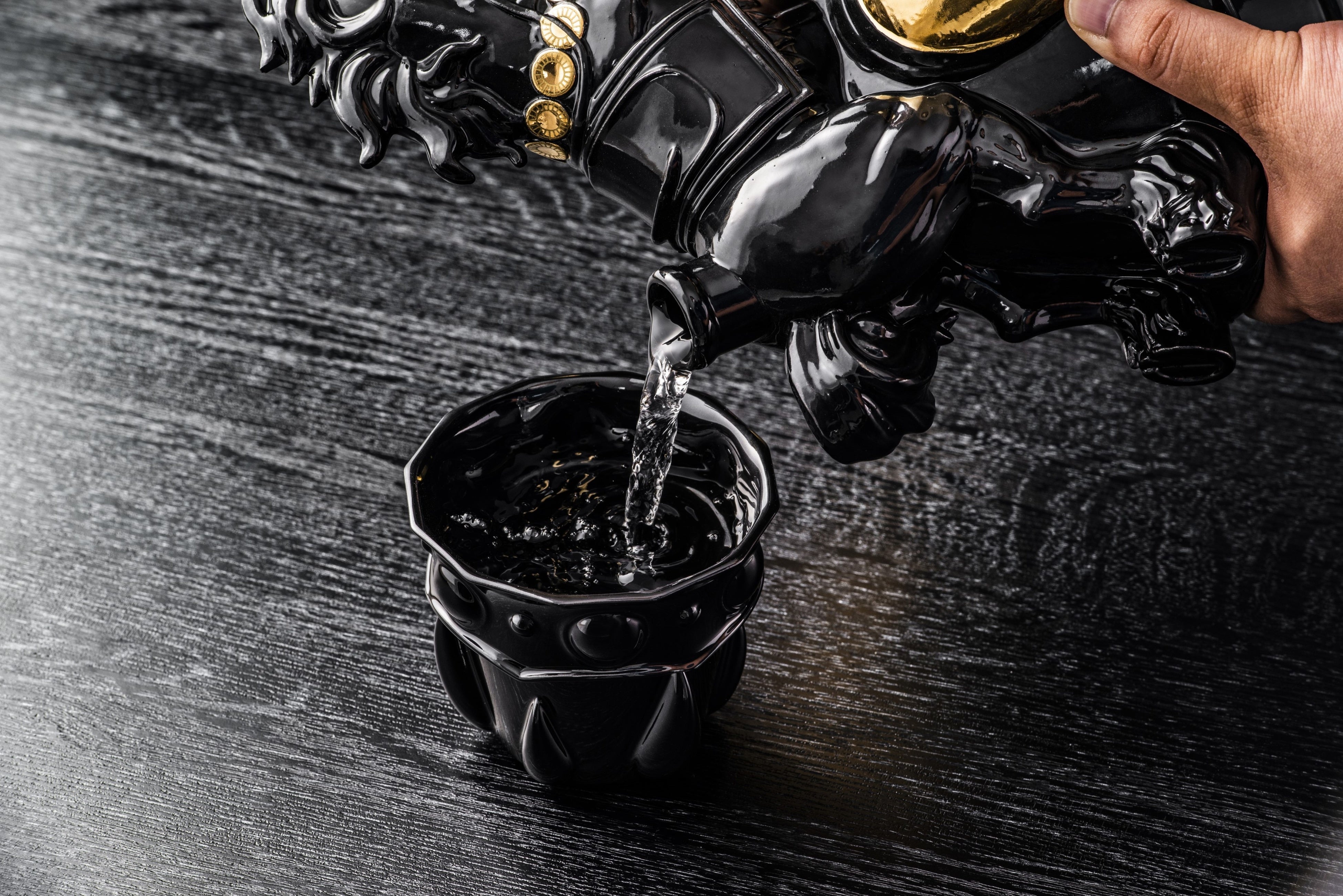 出来上がった原型の設計図が224porcelainの陶芸家 辻氏に渡り、『黒王号ボトル』と『焼酎グラス』の製造を依頼しました。陶磁器での製造には高い技術と経験が必要で、ミリ単位でのこだわりを再現できるよう尽力していただいた結果、度重なる試作を経て、ようやく完成へと至りました。最後に、出来上がったボトルへと、『黒王号』をイメージした芋焼酎を詰め、完成品に仕上がったボトルを手にした時、その気高い美しさに、必ずお喜び頂けることを確信しました。また、デザインのみを追及するだけでなく、持ったとき、使う時の事も考えた焼酎グラスは、手にした瞬間から素晴らしい時間を演出してくれることでしょう。