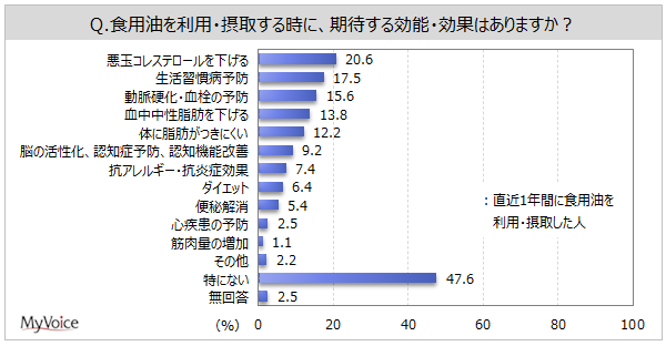 直近1年間に食用油を利用した人に、食用油に期待する効能・効果を聞いたところ(複数回答)、「悪玉コレステロールを下げる」が20.6%、「生活習慣病予防」が17.5%、「動脈硬化・血栓の予防」が15.6%となっています。