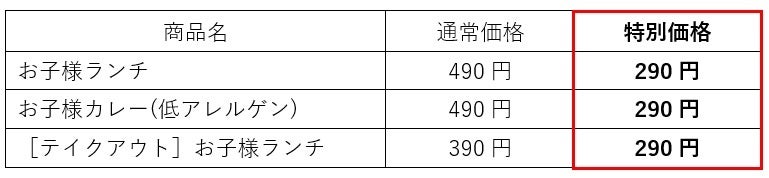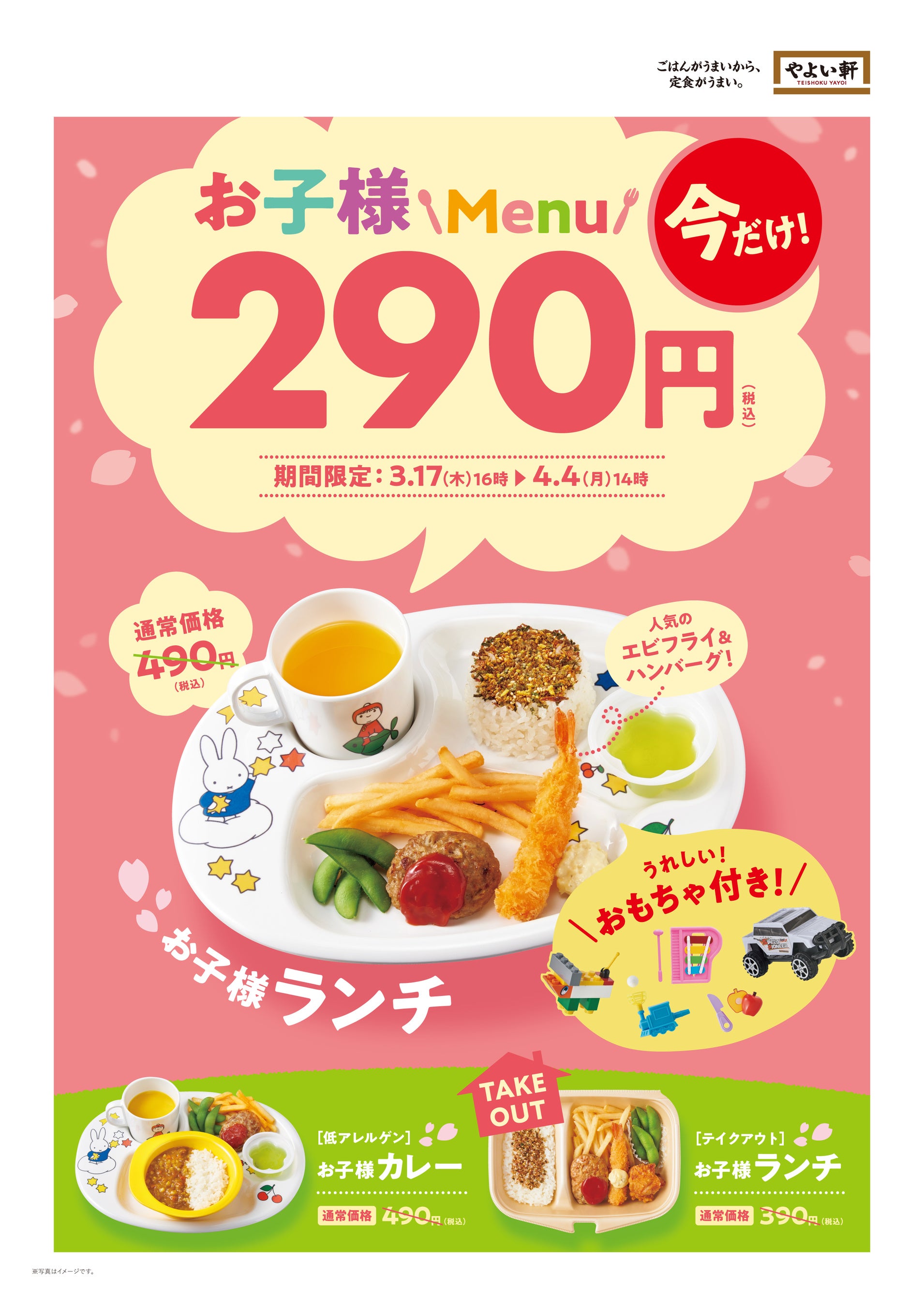 株式会社プレナスは、定食レストラン「やよい軒」を、2022年2月末現在371店舗展開しております。このたび「やよい軒」では、3月17日(木)16時より4月4日(月)14時までの春休み期間中に、一部店舗において販売している『お子様ランチ』490円、『お子様カレー(低アレルゲン)』490円、『[テイクアウト]お子様ランチ』390円を、特別価格290円で提供するキャンペーンを実施いたします。