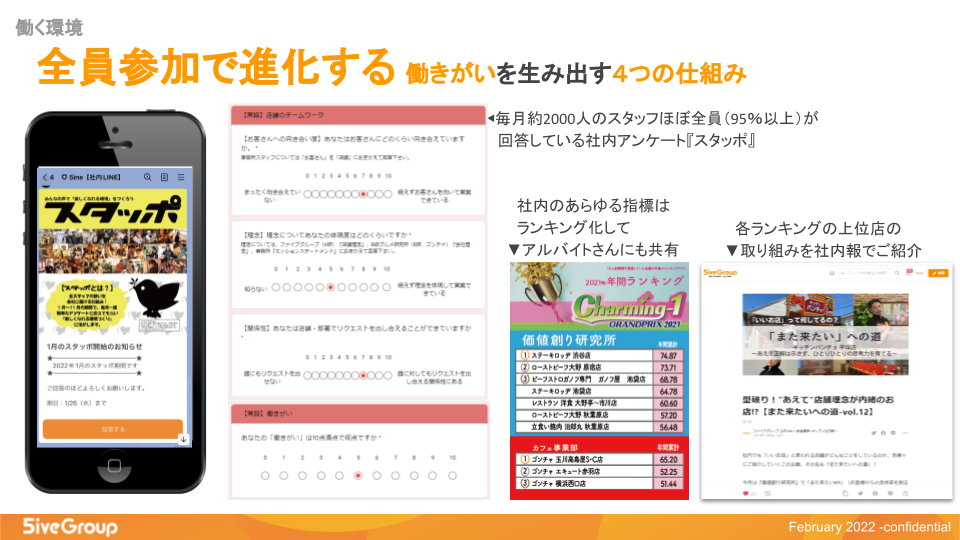 約1800人のアルバイトも含めた全従業員を対象に毎月行う「働きがい」「チームワーク」に関するサーベイを継続して実施。