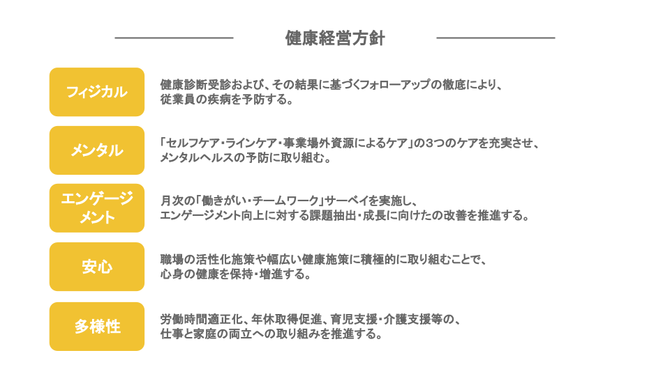 2020年、ファイブグループはより一層健康経営に取り組んでいくにあたり、5つの大きな方針からなる健康経営方針を発表。