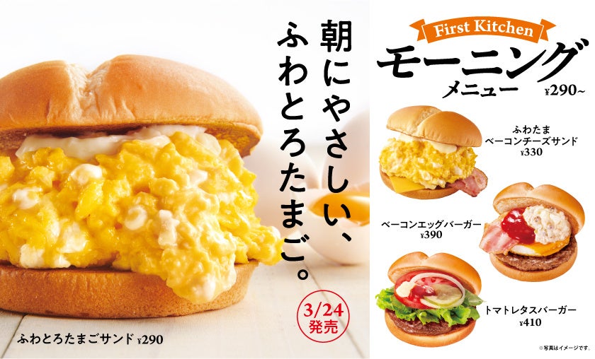 ファーストキッチン株式会社(代表取締役:紫関修所在地:東京都新宿区)では、3月17日(木)より、ファーストキッチン店舗(一部店舗を除く)の、モーニングメニューを一新いたします。朝のお馴染み食材“たまご” にフォーカスし、たまごをたっぷり使用したメニューを筆頭に、しっかりと朝ごはんが食べられるようなラインナップにしました。お店で一つひとつ丁寧に手作りし、見た目にもインパクトのあるふわふわスクランブルエッグを、ぜひファーストキッチンにてご賞味ください!