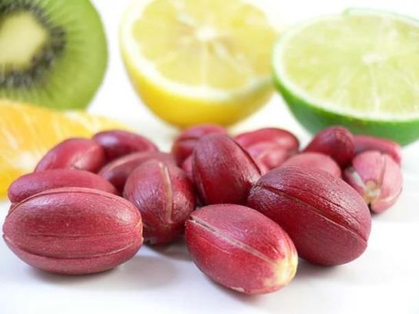 ミラクルフルーツを90秒ほど舐めた後に酸っぱいものを食べると甘く感じる不思議なフルーツ。果実に含まれているたんぱく質「ミラクリン」が甘味の味蕾(みらい)に結合し、酸っぱいものを食べる事で甘味の味蕾を活性化させ甘く感じるように成ります。甘味を感じる効果は約30分~1時間ほど。酸味以外の味に変化はありません。
