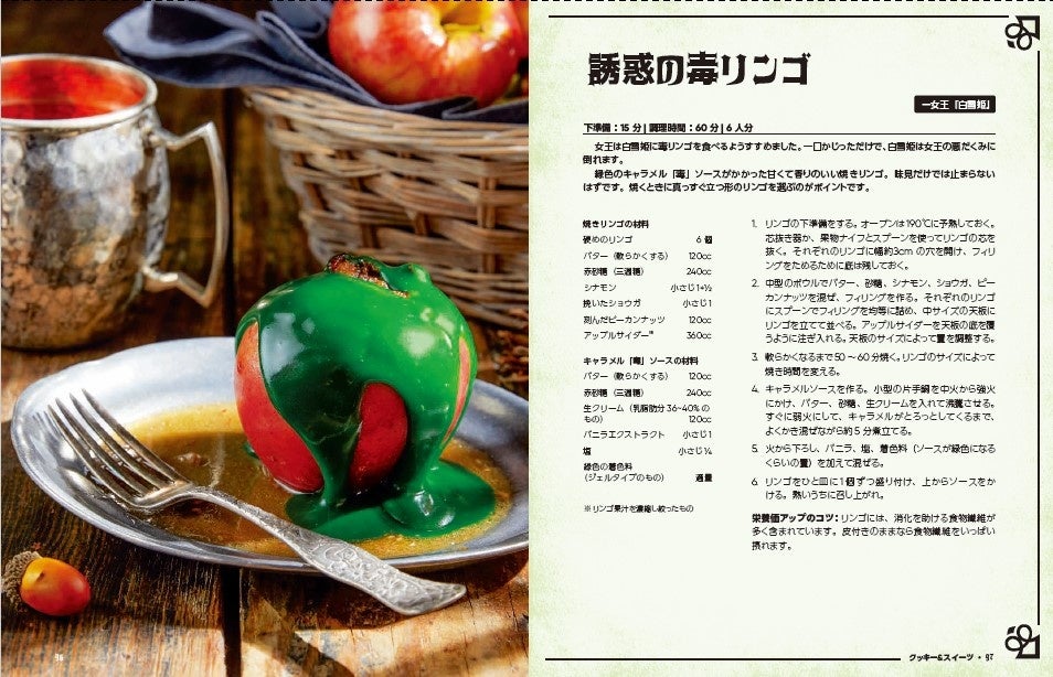 プリンセス版は白雪姫(『白雪姫』)、アリエル(『リトル・マーメイド』)、ラプンツェル(『塔の上のラプンツェル』)など人気のプリンセスに着想を得た優雅で華やかな世界を表現。ヴィランズ版はマレフィセント(『眠れる森の美女』)、クルエラ(『101匹わんちゃん』)、アースラ(『リトル・マーメイド』)など、悪役キャラクターたちから着想を得たウィットに富んだミステリアスな世界を演出します。それぞれ朝食・スイーツ・ドリンクなどカテゴリー別に約50レシピを掲載。