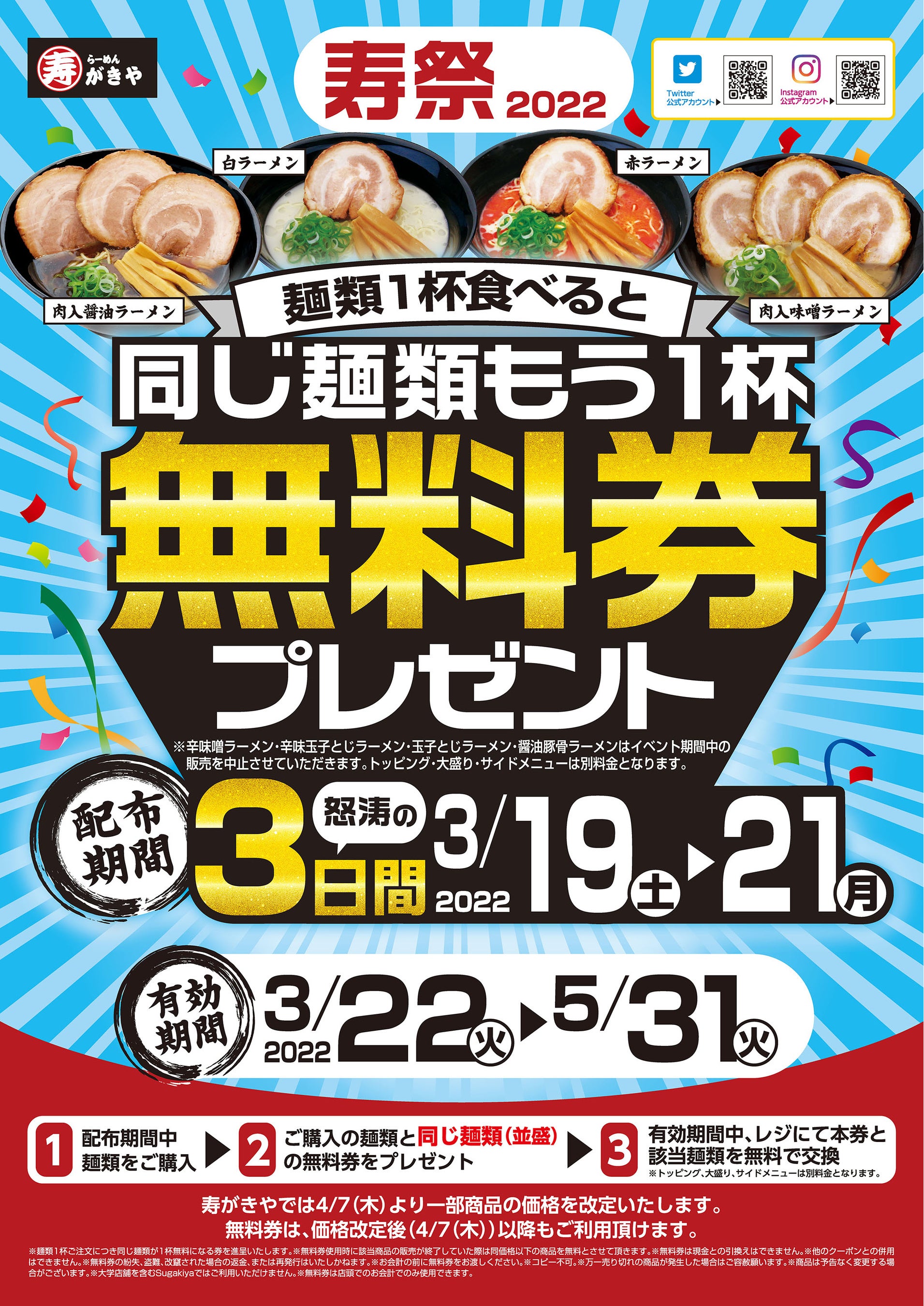 この度、麺の主要な原料である小麦の価格高騰や物流費など諸経費の上昇により、「スガキヤ」では4/14(木)より、「寿がきや」では4/7(木)よりやむを得ず一部商品の価格を改定させて頂きますが、本キャンペーンでプレゼントさせて頂く各種無料券につきましては、価格改定後も「対象となる商品の無料券」としてご利用いただけます。