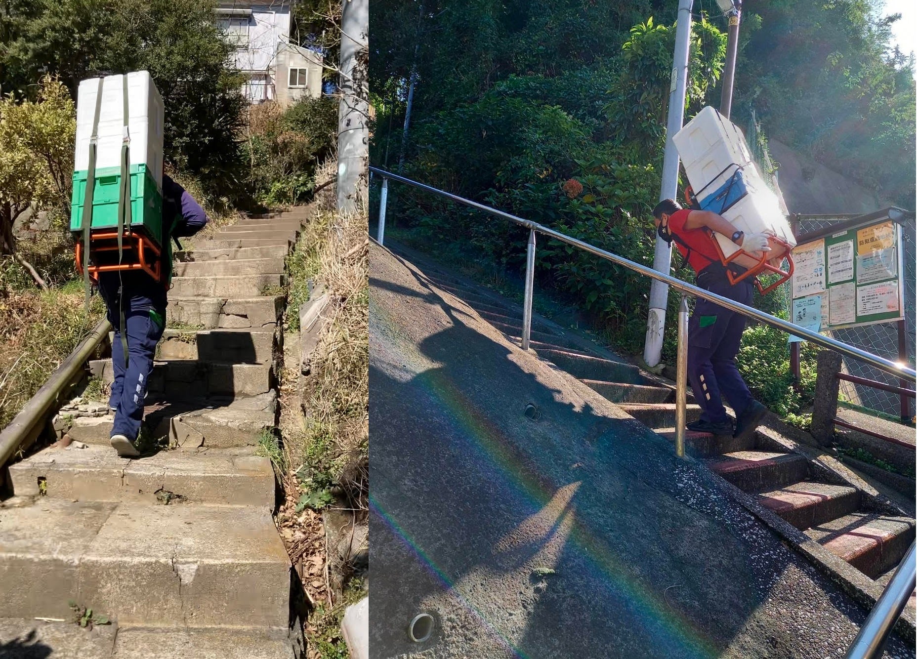 その後、ステーションパルの取り組みを発展させ、2021年より通常手数料に 100円の上乗せを上限として、お届け先までの距離や階段の段数に関わらず個人宅までの配達を開始しました。現在は市内の汐入町、坂本町、東逸見町(一丁目)、不入斗町、富士見町、佐野町、三春町を対象として76世帯で利用されています。