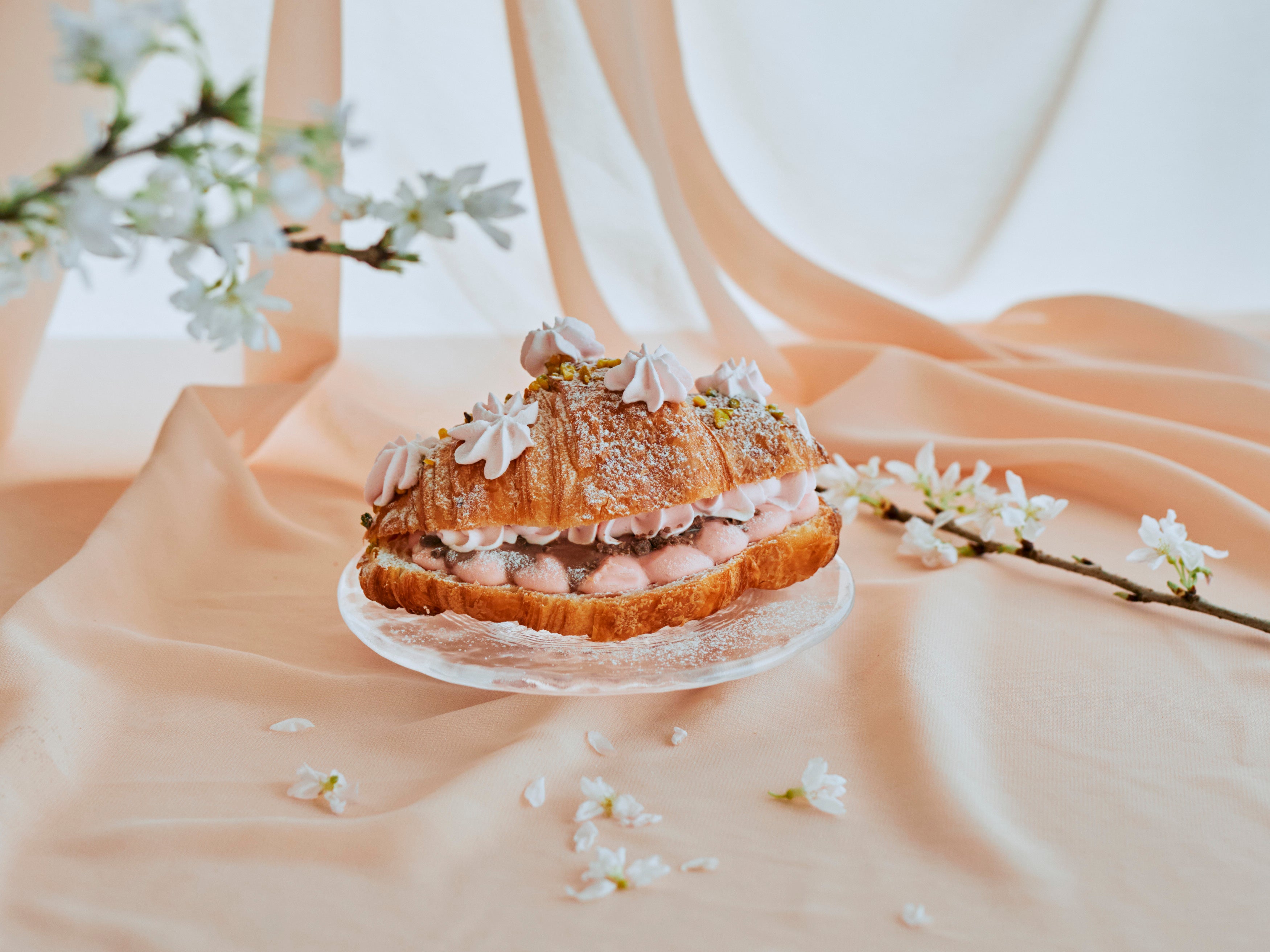 国産の発酵バターで焼き上げたサクサクのクロワッサンの中に、とろり滑らかなカスタードクリームと香り立つ桜の生クリームを重ね、アクセントに粒あんと砕いたチョコレートを加えました。