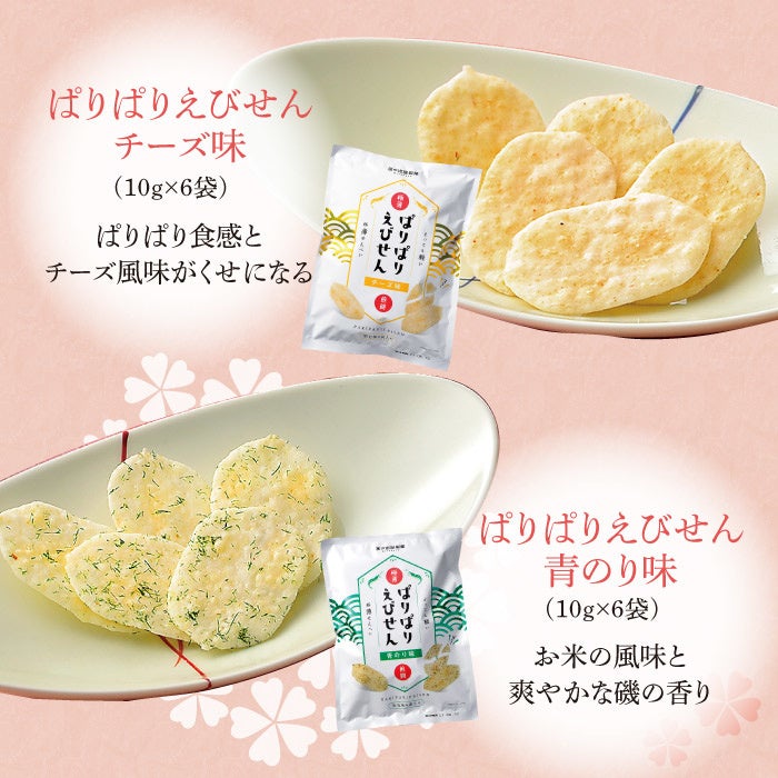 今年の「しろえびせんべい袋」はおやつの定番の「8Pしろえび小判」に加えて、厚めの生地のしっかりした食べ応えが楽しめる「厚焼きしろえびせんべい」、昨年2021年ヒット商品の極薄えびせん「ぱりぱりえびせん」のチーズ味と青のり味の合計4種類の詰め合わせになります。