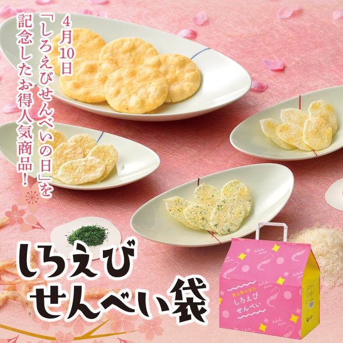 「しろえびせんべい袋」は、4月1日のしろえび漁の解禁、4月10日の「※しろえびせんべいの日」を記念して発売する、春の季節限定の人気商品です。「しろえびせんべいをより多くの方に知っていただきたい」という想いから、しろえびせんべいに特化したお楽しみ袋です。
