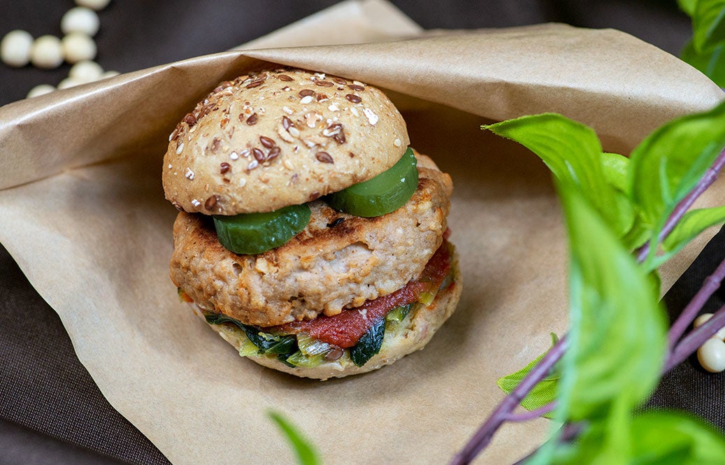 まるでお肉のような味わいの大豆ミートパティを使用し、小松菜・ピクルスをマルティグレインロールのバンズ(ライ麦やオーツ麦の香りと食感が楽しめる雑穀パン)で挟んだハンバーガー。ミニサイズながら食べ応えのあるバーガーです。