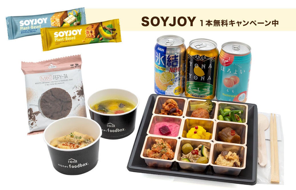 nonpi foodboxサステナブルフードシリーズのプランを3月~6月お届けのお客様限定で大塚製薬の新商品『SOYJOY プラントベースシリーズ』のうちいずれかが付いてきます。