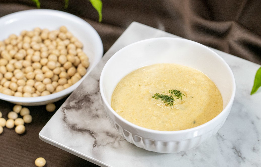 たっぷりのあらごしコーンと豆乳で仕上げたコクのある濃厚な味わいのコーンクリームスープ。