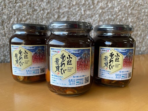 ラベルは、海を想ってごみ拾いをした写真で制作したモザイクアートとなっています。美味しい煮貝をいつまでも味わうために「海の未来のために、今できること」というメッセージを込めました。