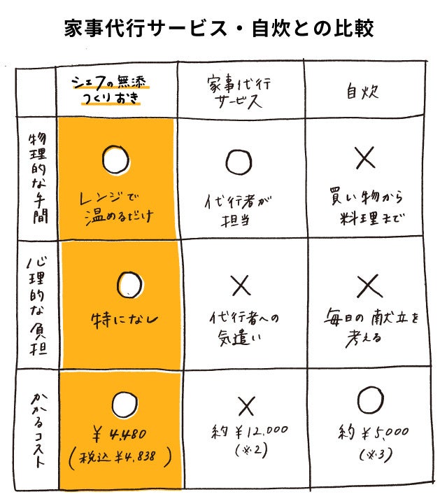 家事代行サービス等を利用する場合、コスト面や”誰かにお願いする”という心理的負担が懸念される方が多い中、「シェフの無添つくりおき」は手軽さ、費用においてすべてストレスフリー。続けやすいのが特徴です。