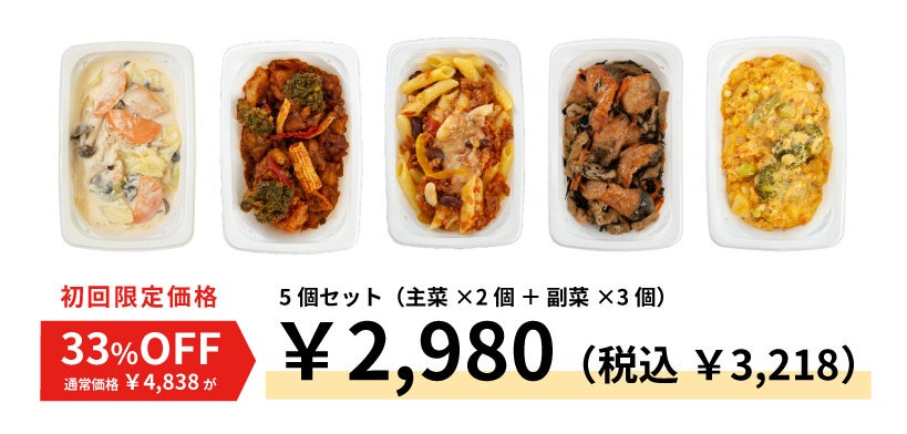 通常5個セットで4,480円(税込4,838円)のところ、初回限定で33%OFFの『2,980円(税込3,218円)』となります。