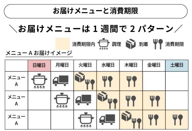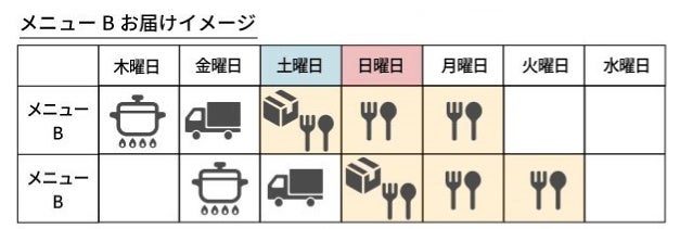 週2回以上ご利用いただく場合は、「火曜日~木曜日」に1回、「土曜日・日曜日」に1回お受取りいただくと、1週間異なるメニューをお召し上がりいただけます。