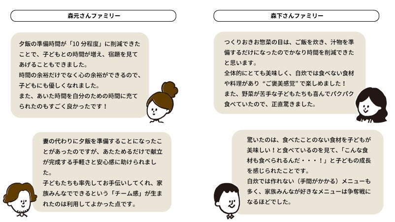 「シェフの無添つくりおき」は、ご協力頂いたモニター家族の方々に実際にサービスをご利用いただき、寄せられたご感想を参考にサービス作りを行いました。