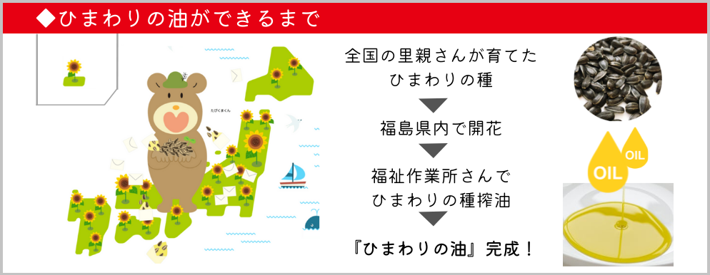 ひまわりカレーに使用されているひまわり油は、全国の里親さん(ひまわりを育ててくださる方)が育てたひまわりの種が福島で再度咲き誇り、その種を福島県内の福祉作業所にて精製していただき、出来上がったものです。