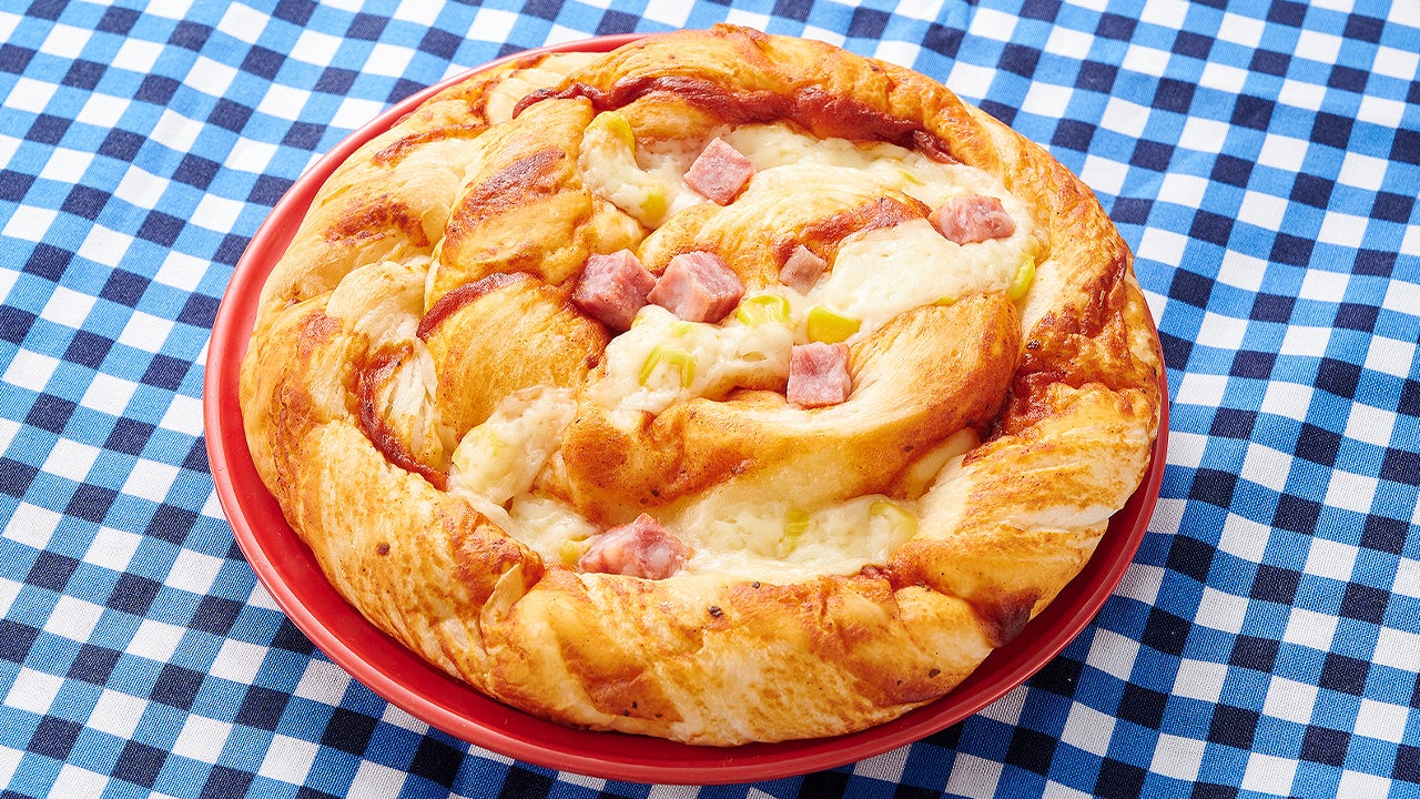 デニッシュ生地にピザソースを塗り、チェダーチーズとダイスハムをトッピングしたピザパンです。