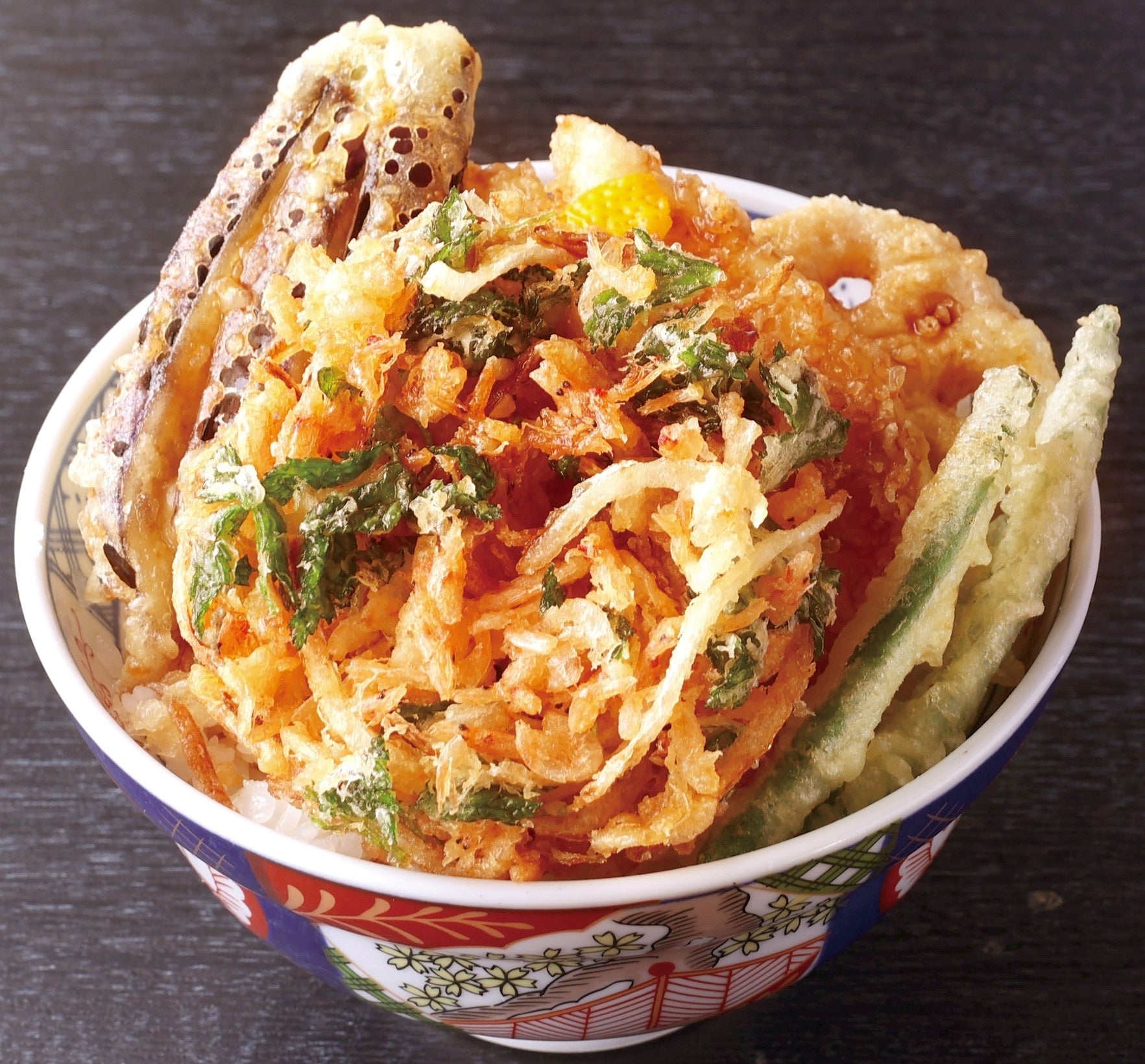 海老、いか、なす、れんこん、かぼちゃ、いんげんと、人気のできたててんぷらを贅沢にのせました。