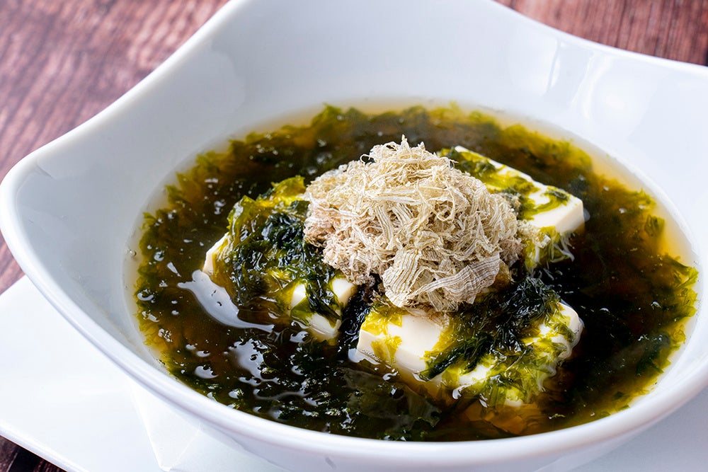 豆腐に熱々の昆布出汁と香り高い青のりに、ふんわり溶ける口どけの優しい羅臼産(らうす)とろろ昆布がのった贅沢な逸品。