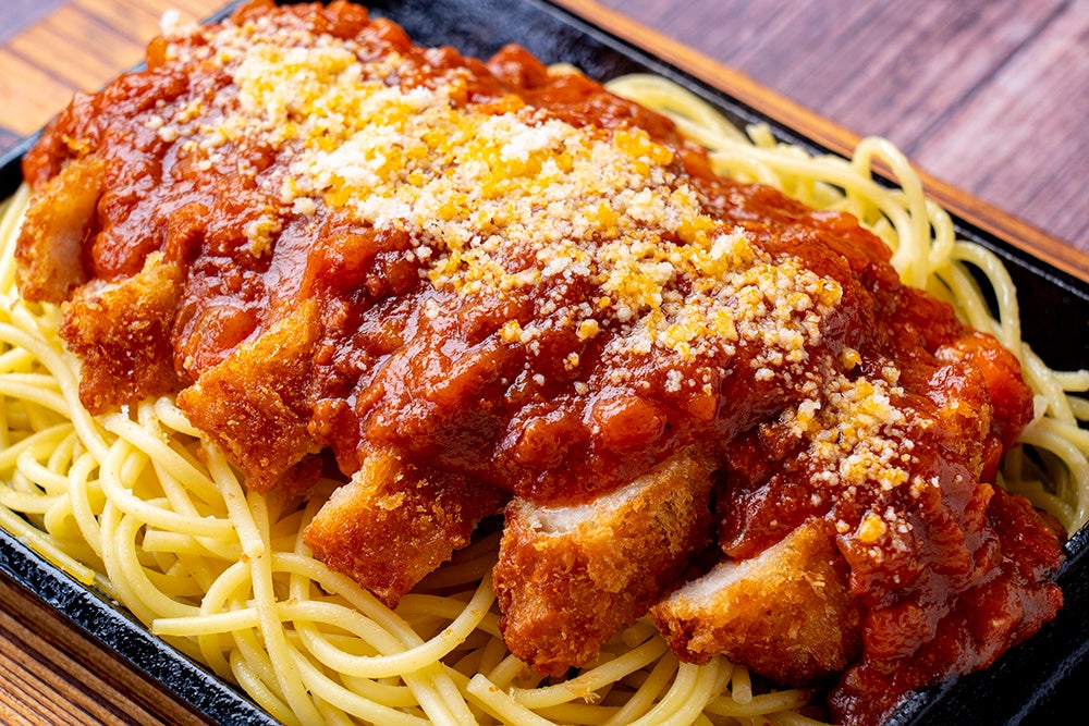 スパカツとは、カツレツをミートソーススパゲティの上にのせた料理の事。熱々の鉄板皿にもられていてボリューム感たっぷり!コッコちゃんは焼鳥屋なので、カツレツをチキンカツにアレンジしました。
