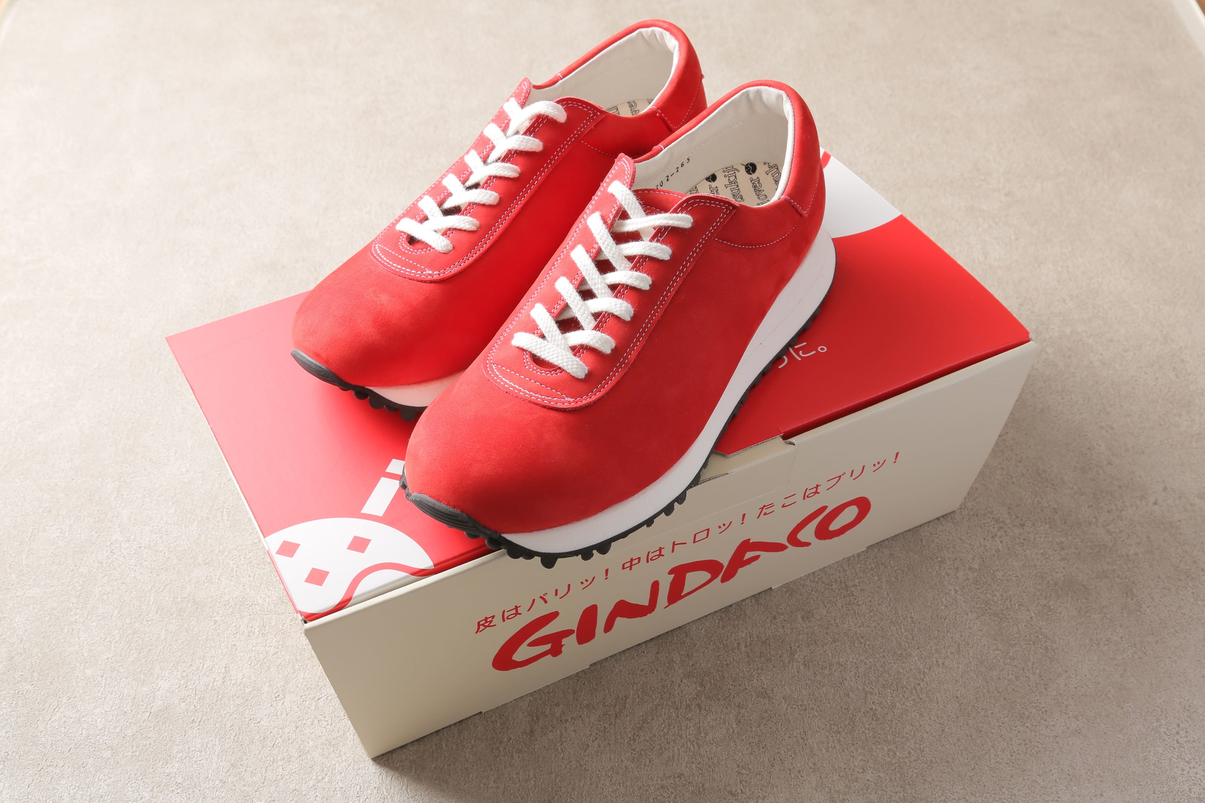 本体材は、星の数ほどある革を吟味した結果、厚口の高級国産ヌバックを採用。色は、目に止まった瞬間に、「銀だこ」 を思い浮かべるような最も鮮やかな赤を採用。毛足の短いヌバックの上品な佇まいに、縫製のステッチは白糸を選択。銀だこのブランドカラーである 「紅白」 の色使いを表現しつつ、洗練されたカジュアルで履きやすい表情となっています。また、右足内側に さりげなくオリジナルの刻印(gindaco)が入っています。