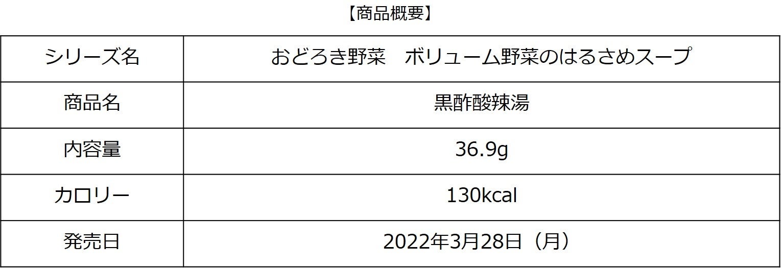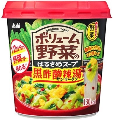 アサヒグループ食品株式会社(本社 東京、社長 川原浩)は、「野菜を食べるスープ」がコンセプトの「おどろき野菜」ブランドから、1/2日分の野菜※が手軽に摂れる『おどろき野菜 ボリューム野菜のはるさめスープ 黒酢酸辣湯』(以下、『黒酢酸辣湯』)を3月28日より全国で新発売します。