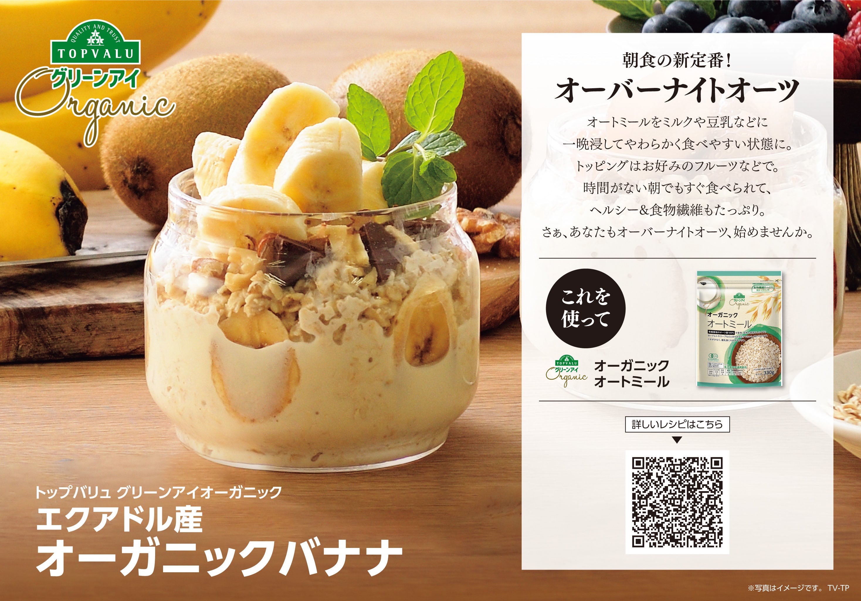 オートミールは、他の食材との相性もよく、トップバリュのWEBサイトでもさまざまな食材と合わせたレシピを公開しています。その中でも特におすすめの食材が“バナナ”です。 オートミール自体には味がほとんどないため、甘みが強く食べ応えがあるバナナとの相性がよく、一緒に食べることでバナナの甘さも引き立ちます。イオンでは、有機JAS認証農場で栽培した、酸味が少なくもっちりとした食感が特長の「トップバリュ グリーンアイオーガニック バナナ」を展開しています。相性もよいオーガニックのバナナと、オーガニックのオートミールで、オーガニックをもっと身近に感じてみませんか?