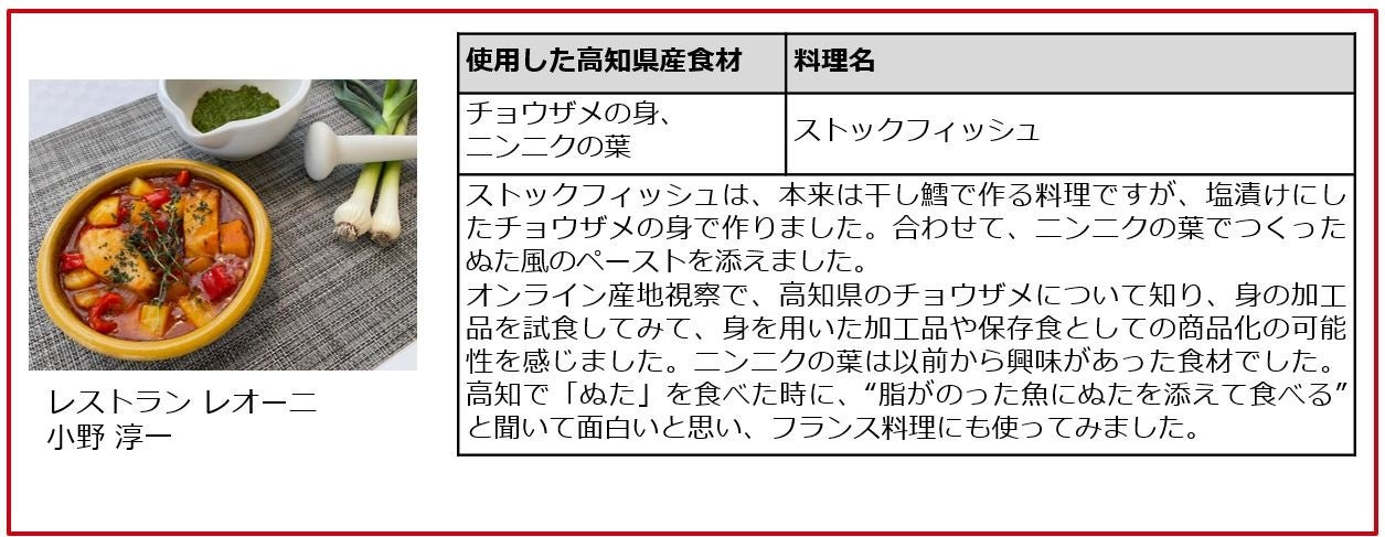 株式会社ぐるなび(本社:東京都千代田区、以下ぐるなび)は、高知県の令和3年度水産物外商活動支援事業委託業務において、高知県産水産物の地産外商を目的に、食の最前線で活躍するCLUB RED(※)を中心とした若手料理人20名の協力を得て、高知県の食材や産品を活用した商品開発プロジェクトに取り組みました。
