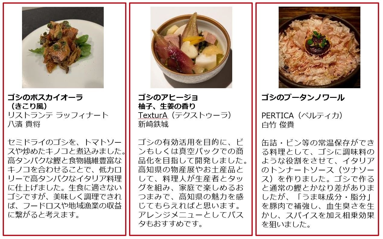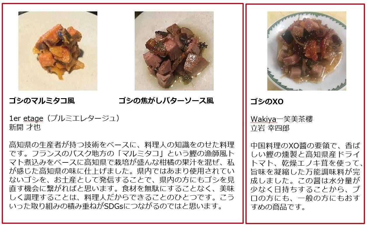 「ゴシ」と呼ばれる味が良くない鰹が一定量水揚げされ、使い道と保管コストに生産者が悩まされている問題を解決しようと、「ゴシ」の消費量を拡大するための商品開発を実施。「ゴシ」の弱点である食感と香りの悪さをカバーするため、鰹節の製造業者に「ゴシ」の水分量を減らし旨味を引き出すセミドライ加工を依頼。加工調整や料理試作を繰り返し、料理人が納得する質の良い「ゴシのセミドライ」が完成。