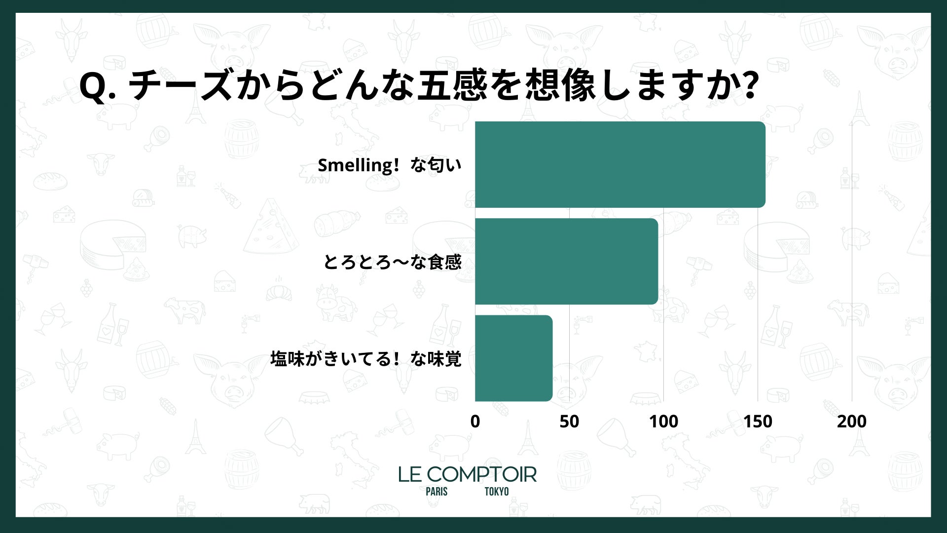 また、ユーザーがチーズと言われて想像するのは、五感の中でも「Smellingな匂い!」が最も高い結果で、「臭さや特徴があってこそチーズらしい」と感じているユーザーの多さも窺えます。