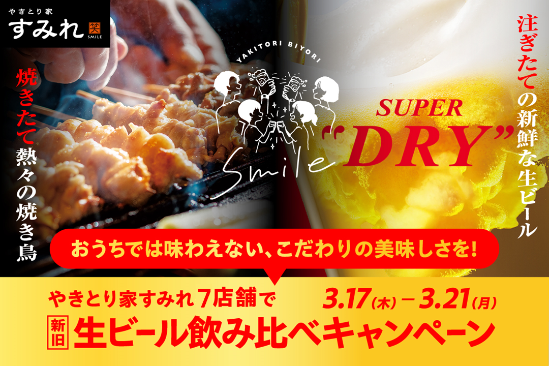 株式会社すみれ(所在地:東京都渋谷区/代表取締役:湯澤忠則)が運営する「やきとり家すみれ」では、お家では味わえない美味しい生ビールを提供したいという想いから、美味しい生ビールにこだわった取り組みをスタート。また新たな取り組みとして、発売から36年!アサヒスーパードライ新旧生ビール飲み比べセットを7店舗で3/17(木)~3/21(月)の5日間、498円(税込548円)で販売いたします。