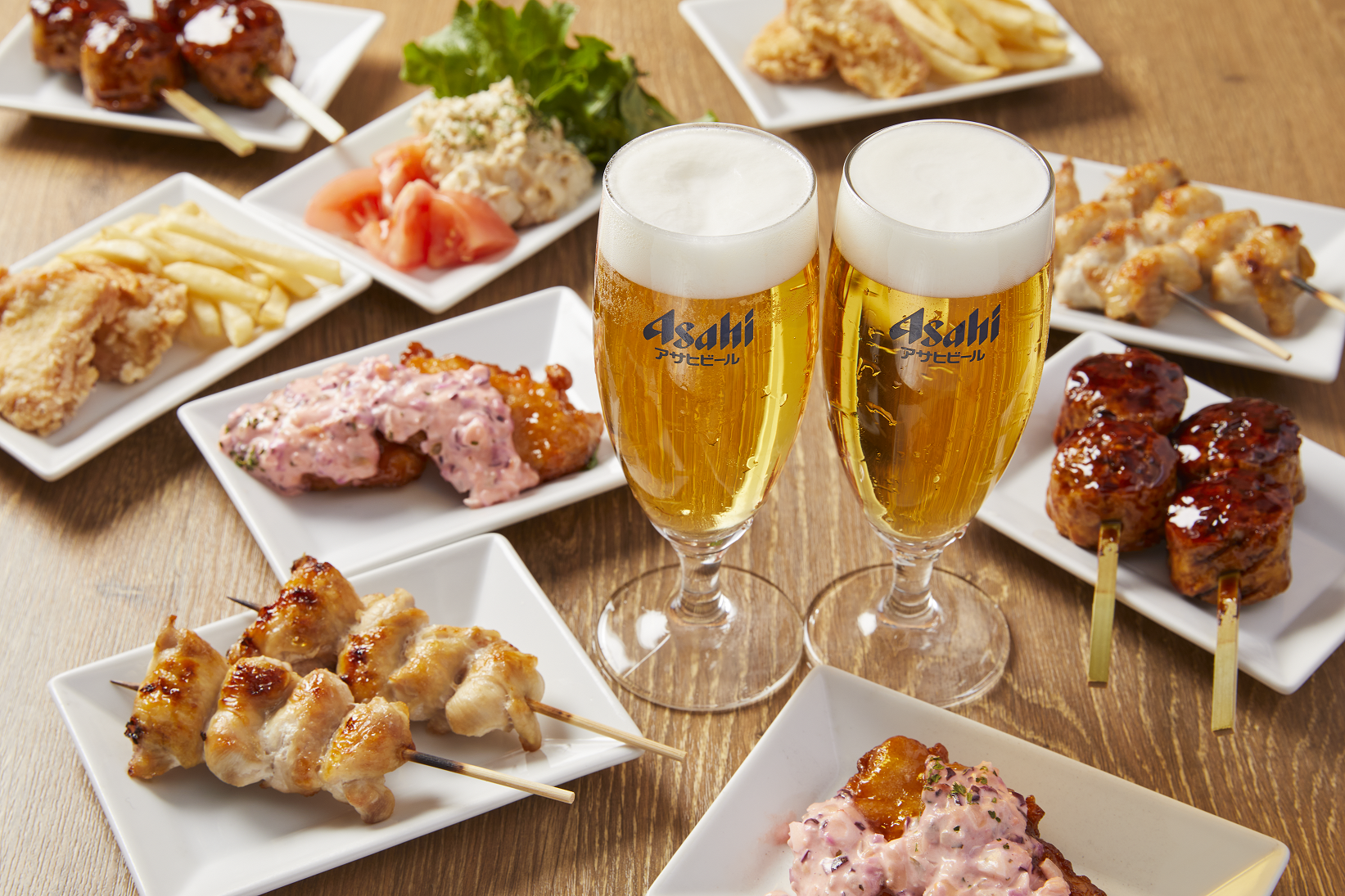 - 注ぎたての生ビールで美味しく楽しむ「やきとり家すみれの名物焼き鳥」
