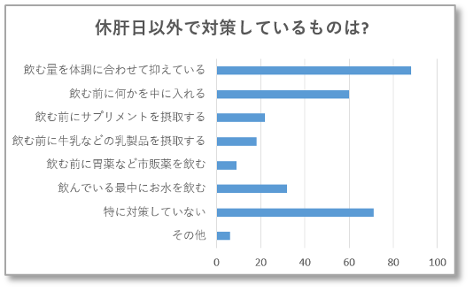 休肝日以外の対策をとっている方も少なくなく、「量の調整」「飲む前に胃薬を飲む」「飲む前に乳製品や何かを摂取」「飲んでいる最中に水を飲む」などありますが、これらは胃腸・肝臓などの負担を一時的に減らす、または悪酔いをさけるための対策であり、肝機能の改善には至っていません。