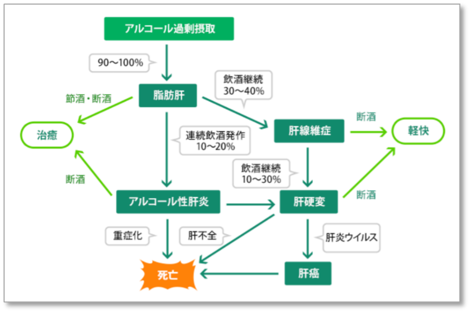 ところが、アルコールを大量に飲み続けると、肝臓で中性脂肪の合成が高まり脂肪肝になります。さらに飲酒を長期間続けると、肝線維症や肝硬変、またアルコール性肝炎になる場合があり、重症化すると生命の危機にも陥ります。それなのに、肝臓は「沈黙の臓器」とも呼ばれるほど病気が進行しないと症状が表れにくいため、日頃のケアがとても重要です。