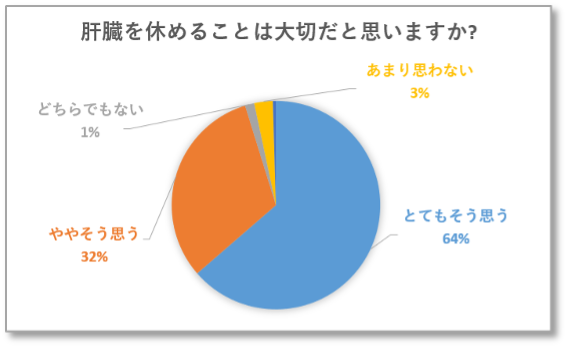 飲酒される方に、「肝臓を休めることは大切だと思いますか」という問いに対して、「とてもそう思う」が64%で、「やや思う」も含めると96%の方が肝臓を休めるもしくは対策が必要と思っていて、飲酒の頻度・量が増えるにつれ、飲酒管理意識も高まっています。