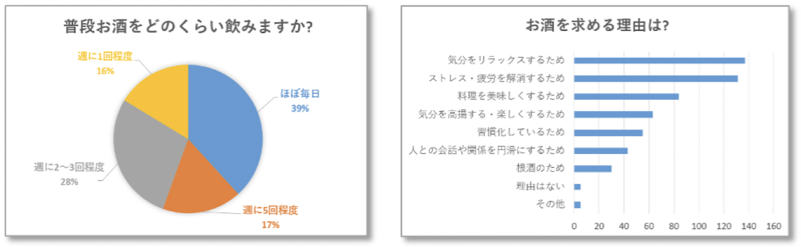 「普段お酒をどのくらい飲みますか」の回答に「ほぼ毎日」「週5日程度」で50%を越える結果となりました。