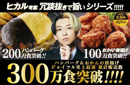 ファミリーレストランのジョイフル(㈱ジョイフル 本社:大分県大分市 代表取締役社長:穴見くるみ)は、全国のジョイフル店舗やオンラインショップにて好評販売中のヒカルさんとのコラボレーション商品『ヒカル考案 冗談抜きで旨いハンバーグ』『ヒカル考案 冗談抜きで旨いおかんの唐揚げ』のシリーズ累計販売数が300万食を突破したことをお知らせします。