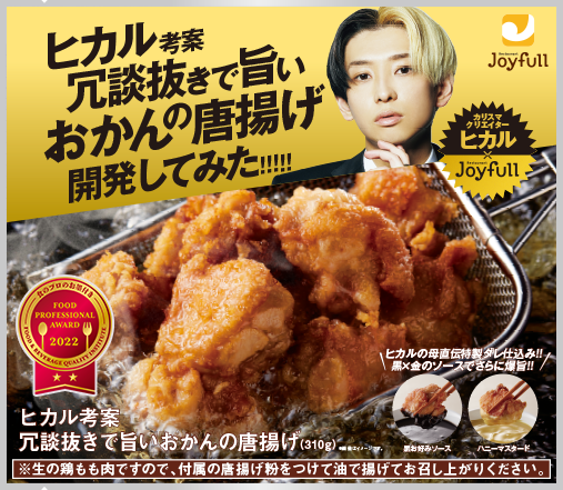 『ヒカル考案 冗談抜きで旨いおかんの唐揚げ』も販売開始後約3週間でジョイフル史上最速での累計販売数50万食を突破し、2022年2月28日には一般社団法人フードプロフェッショナル協会が主催する「Food Professional Award®」にて最高ランクの「3つ星」を受賞しました。