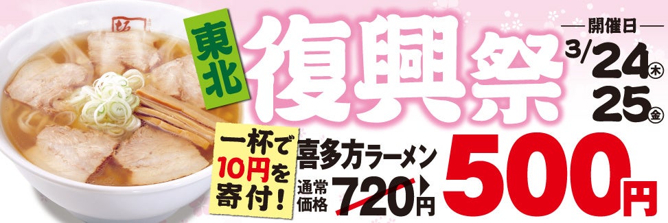 さらに同期間中は、「喜多方ラーメン」をワンコインで提供しお得に召し上がっていただくことで、東北の復興支援への参加を促進します。