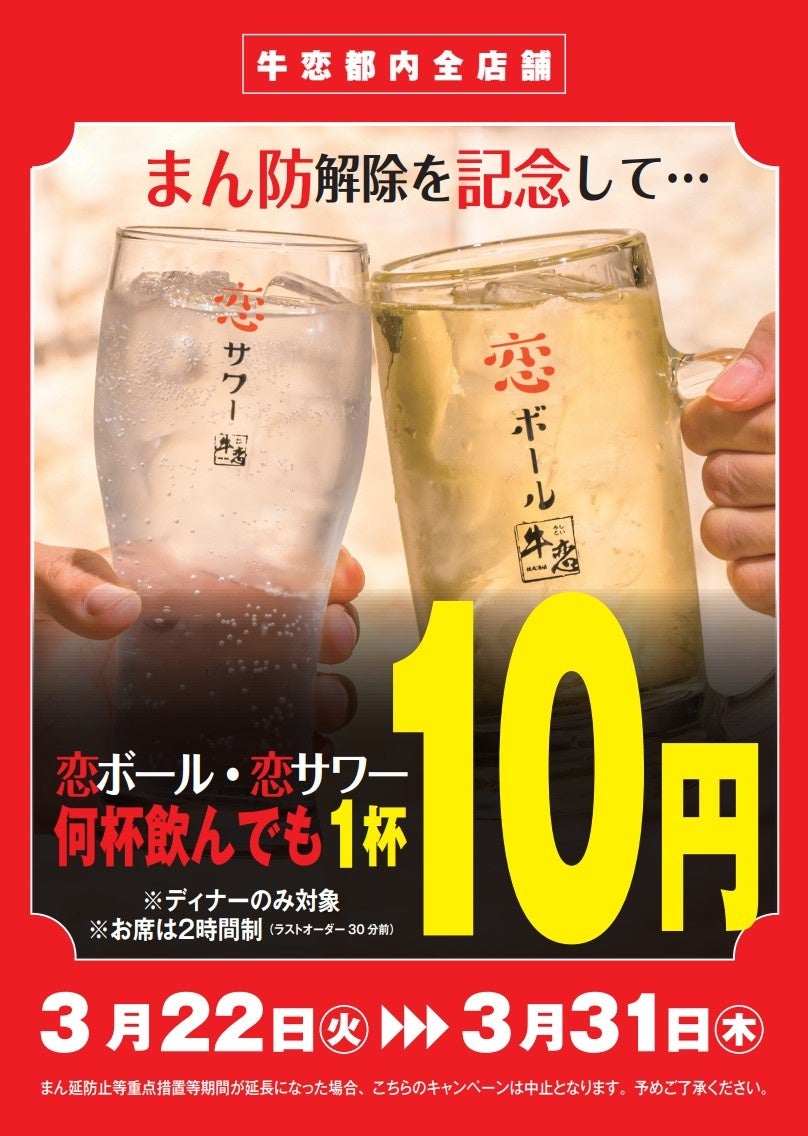 3月22日(火)から3月31日(木)までの【10日間限定】で、「牛恋」人気TOP2ドリンクの「恋ボール」(ハイボール)&「恋サワー」(レモンサワー)を1杯10円で提供するスペシャル キャンペーン。